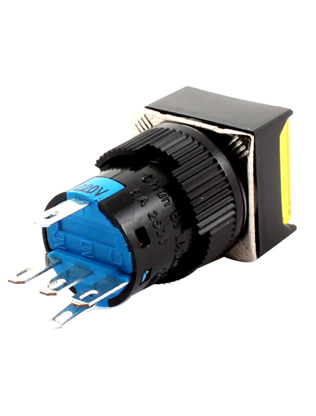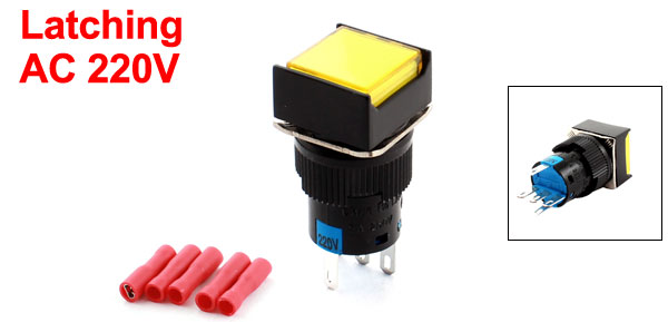 Item Name Square Head Push Button Switch w Crimp Connector Model LA160-16A Contact Type SPDT(1NO 1NC) Action Type Latching Pin Number 5 Voltage, Current AC 250V 5A Light Voltage AC 220V Thread Dia 16mm/0.63" Total Size(Not Included Pin) 31 x 17 x 17mm /1.2" x 0.67" x 0.67" (L *W *H) Light Color Yellow External Color Red, Yellow, Black Material Plastic, Metal Net Weight 11g Package Content 1 x Square Head Push Button Switch