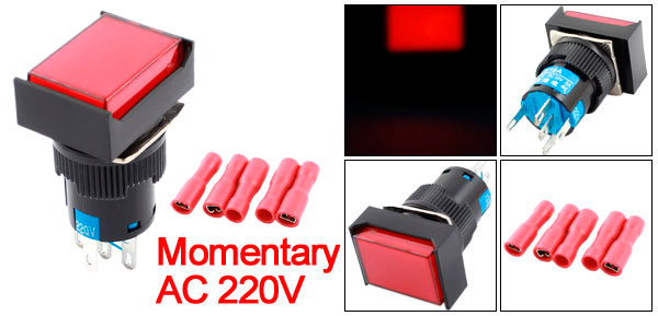 AC220V Red Light Lamp Momentary Pushbutton Switch + 5 x Crimp Connector