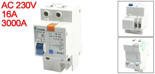 Product Name Circuit Breaker Model No. DZ47LE-1P/16A Exrternal Material Plastic, Metal Rated Voltage AC 230V Rated Current 16A Breaking Capacity 3000A Wire Connecting Type 1P+N Number of Poles 2 Mount Type 35mm DIN Rail Mount Total Size (Approx.) 94 x 45 x 73mm/3.7" x 1.8" x 2.9" (L*W*T) Weight 187g Package Content 1 x Circuit Breaker - Reviews