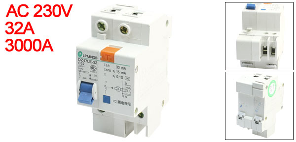 Product Name Circuit Breaker Model No. DZ47LE-1P/63A Exrternal Material Plastic, Metal Rated Voltage AC 230V Rated Current 32A Breaking Capacity 3000A Wire Connecting Type 1P+N Number of Poles 2 Mount Type 35mm DIN Rail Mount Total Size (Approx.) 94 x 45 x 73mm/3.7" x 1.8" x 2.9" (L*W*T) Weight 193g Package Content 1 x Circuit Breaker - Reviews