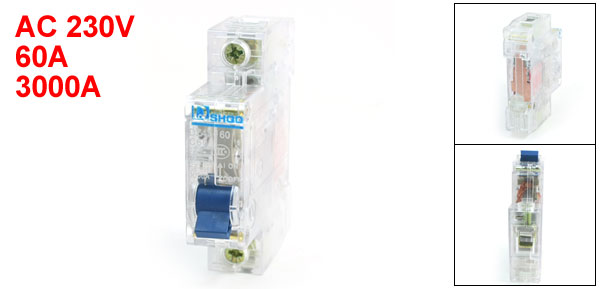 Product Name Miniature Circuit Breaker Model Number DZ47-60 C60 Rated Circuit Breaking Capacity 3000A Rated Voltage AC 230V 50HZ Rated Current 60A Poles 1 Pole for Wire Size 16mm2 Rail Mounting 35mm DIN Rail Overall Size (Approx) 79 x 73 x 18mm/3.1" x 2.8" x 0.71" (L*W*T ) Material Plastic, Electric Components Main Color Clear Net Weight 73g Package Content 1 x Miniature Circuit Breaker - Reviews
