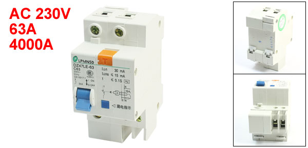 Product Name Circuit Breaker Model No. DZ47LE-1P/63A Exrternal Material Plastic, Metal Rated Voltage AC 230V Rated Current 63A Breaking Capacity 4000A Wire Connecting Type 1P+N Number of Poles 2 Mount Type 35mm DIN Rail Mount Total Size (Approx.) 94 x 45 x 73mm/3.7" x 1.8" x 2.9" (L*W*T) Weight 194g Package Content 1 x Circuit Breaker - Reviews