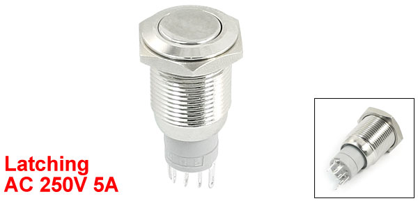 Item Name Push Button Switch Operation Type Latching Type Contact 1NO 1NC Pin Number 5 Head Design High Flat Head Switch Rating AC 250V, 5A Thread Diameter 16mm/0.63" Total Size 38 x 19mm/1.5" x 0.75"(L*Max.W) Material Metal, Electric Parts Housing Color Silver Tone Net Weight 15g Package Content 1 x Push Button Switch - Reviews