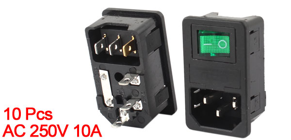 Product Name Power Inlet Socket Power Supply AC 250V 10A Plug Type IEC 320 C14 Rocker Switch Type 3Pin, 2Position; SPST Light Color Green Mounting Type Clamp Type Mount Size 4.8 x 2.8cm/1.9" x 1.1"(L*W) Overall Size 5 x 3.1 x 3.4cm/2" x 1.2" x 1.3"(L*W*T) Fuse Size 5 x 20mm / 0.2" x 0.8" (D*L) Material Plastic, Metal Color Black, Silver Tone Net Weight 203g Package Content 10 x Power Inlet Socket w Rocker Switch w Fuse - Reviews