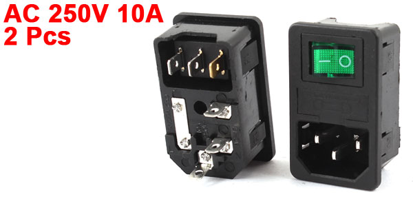 AC250V 10A SPST Green Lamp Rocker Switch IEC320 C14 Inlet Socket w Fuse 2 Pcs