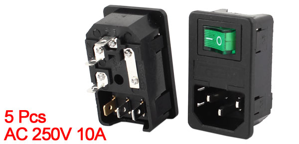 Product Name Power Inlet Socket Power Supply AC 250V 10A Plug Type IEC 320 C14 Rocker Switch Type 3Pin, 2Position; SPST Light Color Green Mounting Type Clamp Type Mount Size 4.8 x 2.8cm/1.9" x 1.1"(L*W) Overall Size 5 x 3.1 x 3.4cm/2" x 1.2" x 1.3"(L*W*T) Fuse Size 5 x 20mm / 0.2" x 0.8" (D*L) Material Plastic, Metal Color Black, Silver Tone Net Weight 114g Package Content 5 x Power Inlet Socket w Rocker Switch w Fuse - Reviews