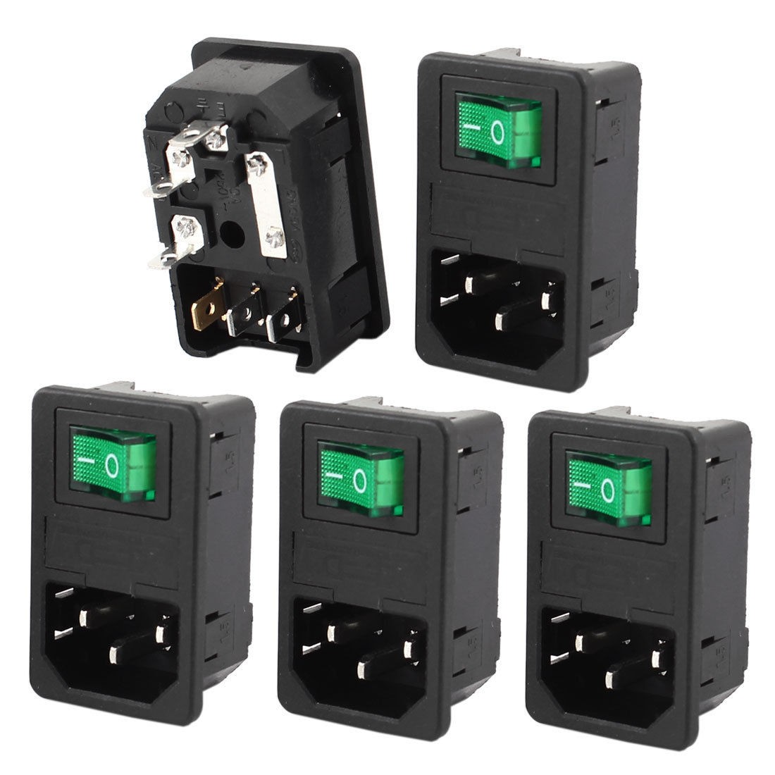 AC250V 10A SPST Green Lamp Rocker Switch IEC320 C14 Inlet Socket w Fuse 5 Pcs