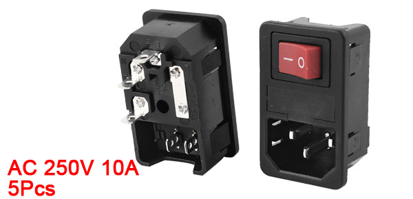AC250V 10A SPST Red Button Rocker Switch IEC320 C14 Inlet Socket w Fuse 5Pcs