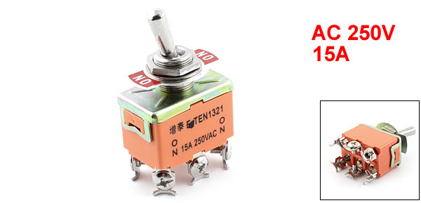 DetailsAC250V 15A 12mm Thread DPDT 6 Screw Terminal Locking Toggle Switch Orange  Main Color Orange Terminals 6 Screw Terminals Country of Manufacture CHINA Action Type Latching Material Metal Contact Type DPDT Total Size 33 x 20 x 58mm/1.3"x 0.8" x 2.3"(L*W*H) Product Name Toggle Switch Rated AC 250V 15A Net Weight 36g Package Content 1 x Toggle Switch Position ON/OFF Thread 12mm/0.47"