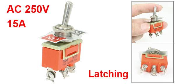 Product Name Toggle Switch Rating AC 250V 15A Pin Number 3 Terminals Position 2 Position(On/ON) Screw Diameter 12mm Total Size(Approx.) 5.5 x 3 x 1.2cm / 2.2" x 1.2" x 0.5"(L*W*T) Material Plastic,Metal Color Orange,Silver Tone Weight 21g Package Content 1 x Toggle Switch - Reviews