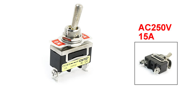 DetailsAC250V 15A SPST 2 Positions Latching Toggle Switch for Switching Light  Product Name Toggle Switch Model C511B Type SPST Voltage & Current AC250V 15A Position 2 Position Mounting Hole Diamter 12mm / 0.47" Main Body Size 30 x 16 x 17mm / 1.2" x 0.63" x 0.67"(L*W*H) Overall Height 55mm / 2.2" Material Metal & Resin Color Black, Silver Tone Weight 27g Package Content 1 x Toggle Switch