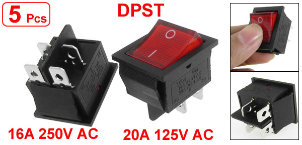 Product Name Rocker Switch Poles DPST(On - Off) Terminals 4 Pin Rating Voltage 16A 250V AC 20A 125V AC Total Size(Each One) 3.1 x 2.5 x 3.5cm / 1.2" x 0.9" x 1.4"(L * W * T) Mount Hole Size 2.9 x 2.15mm / 1.14" x 0.85"(L*W) Color Black, Red Material Plastic & Metal Total Weight 56g Package Content 5 x Rocker Switches - Reviews