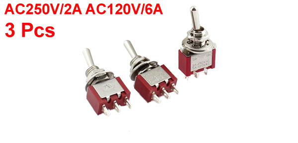 Product Name Toggle Switch Thread Dia 6mm/0.24" Main Color Red, Silver Tone Net Weight 15g Country of Manufacture CHINA Package Content 3Pcs x Toggle Switch Rating AC 250V 2A, AC 120V 6A Material Metal Contact Type SPDT Total Size 32 x 14 x 12mm/1.3" x 0.55" x 0.47"(L*W*Max.D) Pin Number 3 Positions 2 Positions(On/On) - Reviews