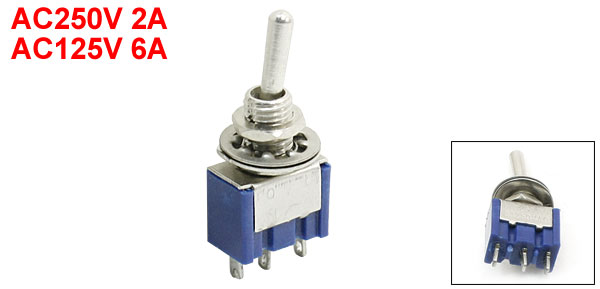 DetailsAC250V 2A AC125V 6A SPDT 3 Pin Terminals 2 Position Locking Toggle Switch  Product Name Toggle Switch Rated Voltage & Current AC250V 2A AC125V 6A Pin Number 3 Pins Position 2 Positions(ON/ON) Type SPDT(Latching) Mounting Hole Diameter 5.6mm / 0.22" Body Size(Approx.) 13 x 10 x 8mm /0.51" x 0.39" x 0.315"(L*W*T) Total Height 33mm / 1.3" Material Plastic, Metal Weight 6g Package Content 1 x Toggle Switch