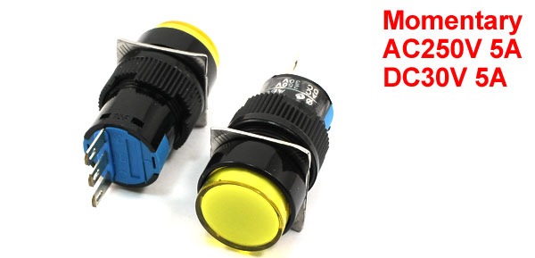 Item Name Push Button Switch Contact Type Momentary SPDT Working Voltage AC250V 5A DC30V 5A Mounting Thread Diameter 15mm / 0.6" Button Cap Dia 15mm /0.6" Terminals 3 Pin Overall Size 4 x 1.8 x 1.8cm/1.6" x 0.7" x 0.7"(L*W*T) Material Plastic, Electronic Parts Weight 30g Package Content 5 Pcs x Push Button Switch - Reviews