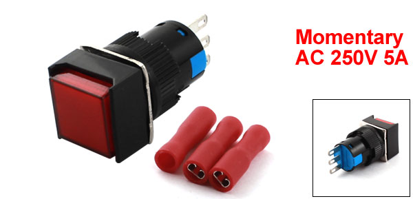 Item Name Square Head Push Button Switch w Crimp Connector Model LA160-16A Contact Type SPDT(1NO 1NC) Action Type Momentary Pin Number 3 Voltage, Current AC 250V 5A Thread Dia 16mm/0.63" Total Size(Not Included Pin) 31 x 17 x 17mm /1.2" x 0.67" x 0.67" (L *W *H) External Color Red, Black Material Plastic, Metal Net Weight 9g Package Content 1 x Square Head Push Button Switch