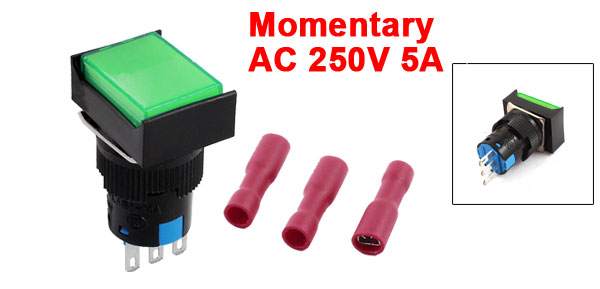 Item Name Rectangle Head Push Button Switch w Crimp Connector Model LA160-16A Contact Type SPDT(1NO 1NC) Action Type Momentary Pin Number 3 Voltage, Current AC 250V 5A Thread Dia 16mm/0.63" Total Size(Not Included Pin) 31 x 24 x 17mm /1.2" x 0.9" x 0.67" (L *W *H) External Color Green, Black Material Plastic, Metal Net Weight 10g Package Content 1 x Rectangle Head Push Button Switch