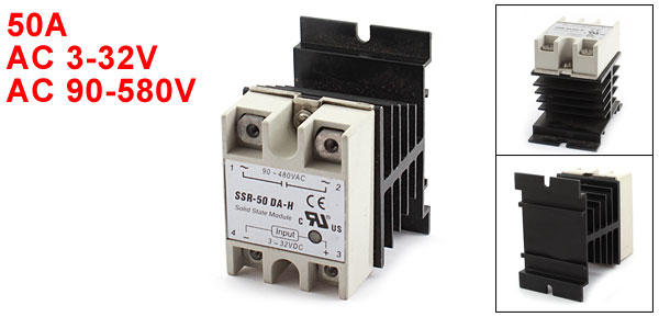 Product Name Solid State Relay w Heatsink Model No. SSR-50DA-H Rated Current 50A Input Voltage AC 3-32V Output Voltage AC 90-580V Screw Terminal 4 Screw Hole Dia 4mm/0.16" Fixing Hole Center Distance 2.8 x 4.1cm(W*L)(Center to Center) Relay Size (Approx.) 6 x 4.5 x 2.2cm/2.4" x 1.8" x 0.87"(L*W*H) Total Size 8 x 5 x 7.3cm/3.1" x 2" x 3"(L*W*H) Heatsink Material Aluminum, Plastic Color Clear, Black Net Weight 205g Package Content 1 x Solid State Relay w Heatsink - Reviews