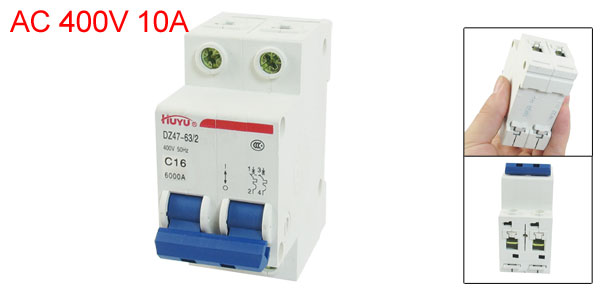 Product Name Miniature Circuit Breaker Model Number DZ47-63 C10 Rated Circuit Breaking Capacity 6000A Rated Voltage AC 400V Rated Current 10A Poles 2 Pole Rail Mounting 35mm DIN Rail Overall Size (Approx) 66 x 35 x 77mm/ 2.6" x 1.37" x 3" (L*W*T ) Material Plastic, Electric Components Color Off White Weight 183g Package Content 1 x Miniature Circuit Breaker - Reviews