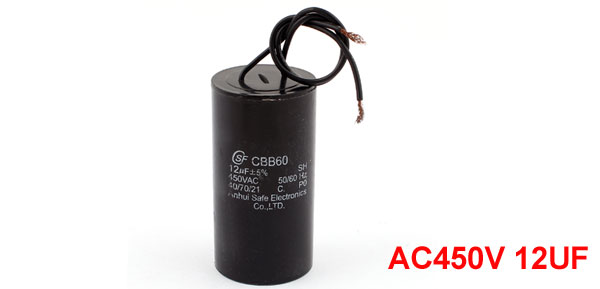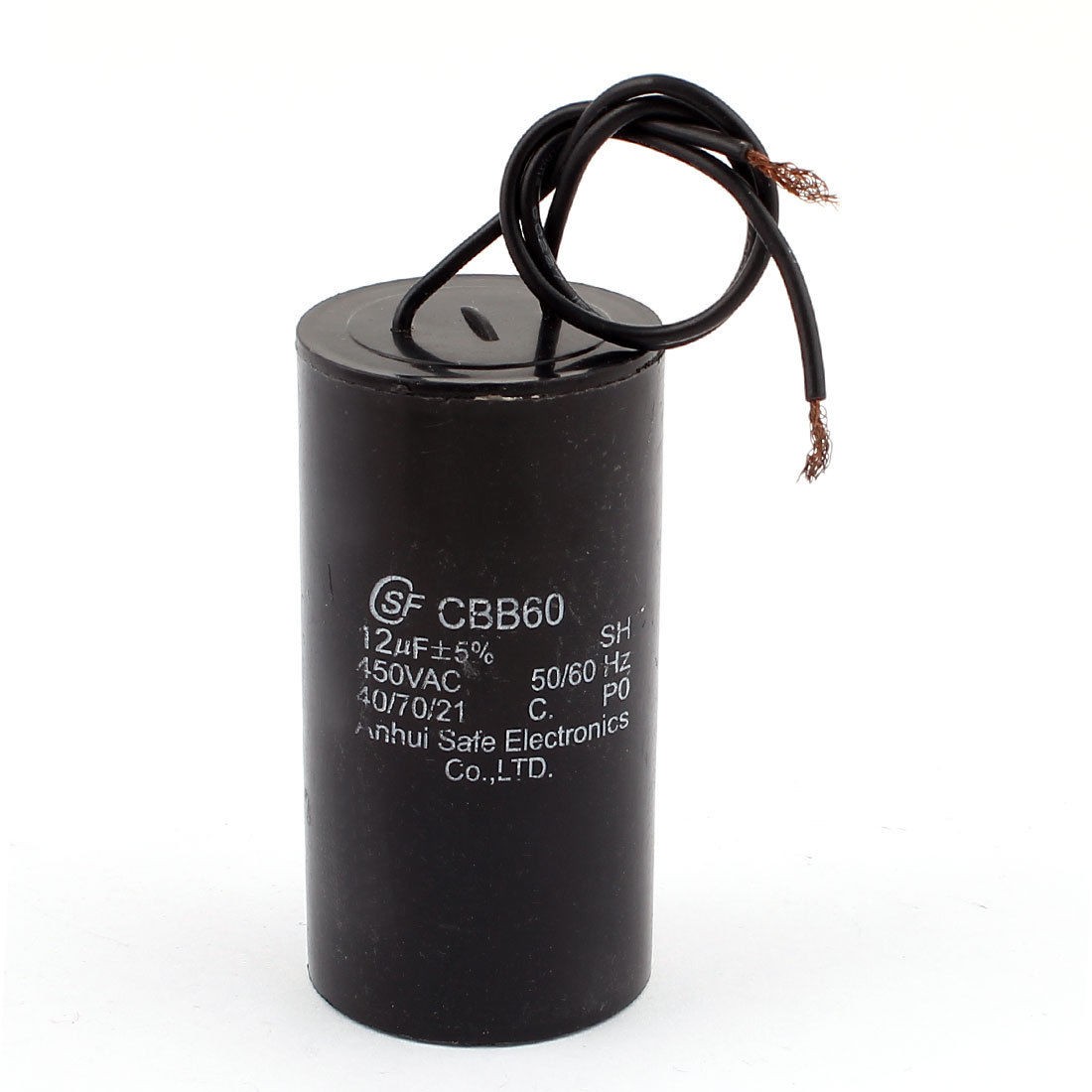 Product Name Motor Capacitor Housing Material Plastic Dielectric Material Polypropylene Film Model CBB60 Capacitance 12uF Tolerance ±5% Rated Voltage AC 450V Frequency 50/60Hz Body Size 3.7 x 7.3cm/ 1.5" x 2.8"(D*H) Wire Length 13cm /5" Color Black Weight 79g Package Content 1 x Motor Capacitor - Reviews
