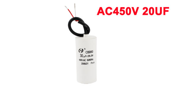 Product Name Motor Capacitor Housing Material Plastic Dielectric Material Polypropylene Film Model CBB60 Capacitance 30uF Tolerance ±5% Rated Voltage AC 450V Frequency 50/60Hz Body Size 4.5 x 9.6cm/ 1.8" x 2.8"(D*H) Wire Length 20cm / 8" Color White Weight 159g Package Content 1 x Motor Capacitor - Reviews