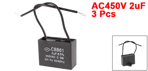 DetailsAC450V 2uF Wired Metalized Polypropylene Film Motor Capacitor 3 Pcs  Product Name Motor Capacitor Model CBB61 Color Black External Material Plastic Dielectric Material Metalized Polypropylene Film Rated Capacitance 2uF Tolerance ±5% Rated Frequency 50/60Hz Rated Voltage AC450V Body Size 38 x 27 x 28mm/ 1.4" x 1" x 1.1"(L*W*T) Fixing Hole Diameter 4mm/0.15" Cable Length 9cm/ 3.5" Net Weight 60g Package Content 3 x Motor Run Capacitor