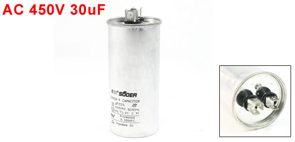 Product Name Motor Capacitor Material Polypropylene Film Model CBB65A-1 Type Anti-Explosion Capacitance 30uF Tolerance ±5% Rated Voltage AC 450V Frequency 50/ 60Hz Temperature Coefficient 40/70/21 Body Dimension 11 x 5cm/ 4.3" x 2"(H*D) Total Length 12cm/ 4.7" Color Silver Tone Weight 218g Package Content 1 x Motor Capacitor - Reviews