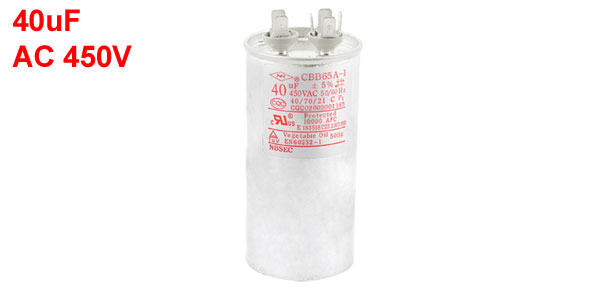 Product Name Motor Capacitor Material Polypropylene Film Model CBB65A-1 Type Anti-Explosion Capacitance 40uF Tolerance ±5% Rated Voltage AC 450V Frequency 50/ 60Hz Temperature Coefficient 40/70/21 Body Dimension(Not Include Pin) 10 x 5cm/ 3.9" x 2"(H*D) Total Length 11cm/ 4.3" Color Silver Tone Weight 208g Package Content 1 x Motor Capacitor - Reviews