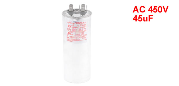 Product Name Motor Capacitor Material Polypropylene Film Model CBB65A-1 Type Anti-Explosion Capacitance 45uF Tolerance ±5% Rated Voltage AC 450V Frequency 50/ 60Hz Temperature Coefficient 40/70/21 Body Dimension(Not Include Pin) 12 x 5cm/ 4.7" x 2"(H*D) Total Length 13.5cm/ 5.3" Color Silver Tone Weight 218g Package Content 1 x Motor Capacitor - Reviews