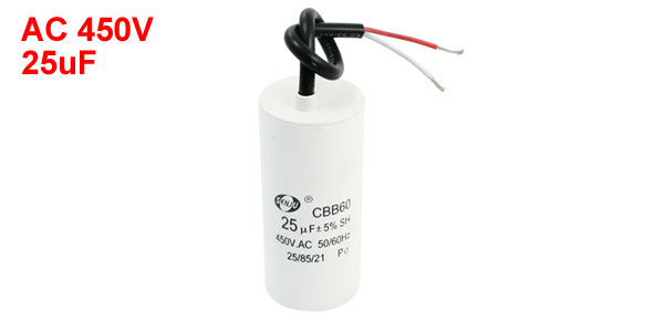 Product Name Motor Capacitor Housing Material Plastic Dielectric Material Polypropylene Model CBB60 Capacitance 25uF Tolerance ±5% Rated Voltage AC 450V Frequency 50/60Hz Temperature 25/85/21 Body Size 4.5 x 10cm / 1.8" x 3.9" (D * H) Wire Size(Approx.) 20 x 6cm /8" x 0.24" (L * Max.D) Color Black, White Weight 152g Package Content 1 x Motor Capacitor - Reviews