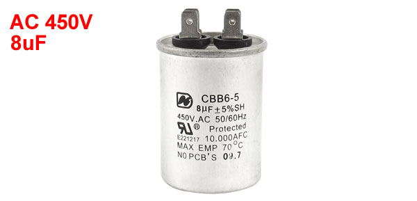 DetailsAC450V 8uF 50/60Hz Polypropylene Film Motor Run Capacitor CBB65  Product Name Motor Capacitor Model CBB65 Dielectric Material Polypropylene Film Housing Material Plastic Pin Quantity 4 Capacitance 8µF Tolerance ±5% Rated Frequency 50/60Hz Rated Voltage AC 450V Size 4cm x 6.7cm/ 1.6" x 2.6" (Dia.*H) Color Silver Tone Weight 80g Package Content 1 x Motor Capacitor