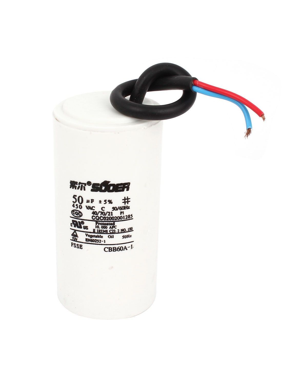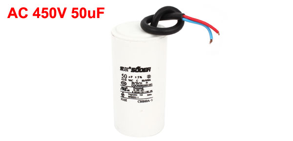 Product Name Motor Capacitor Housing Material Plastic Dielectric Material Polypropylene Film Model CBB60A-1 Capacitance 50uF Tolerance ±5% Rated Voltage AC 450V Frequency 50/60Hz Body Size 10 x 4.8cm/ 4" x 1.8"(H*D) Wire Length 17cm / 6.7" Color White Weight 164g Package Content 1 x Motor Capacitor - Reviews