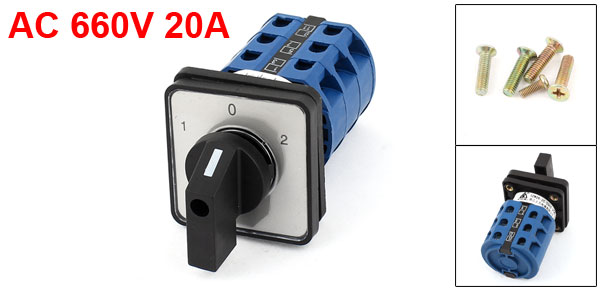 440V 5A 5.5A 7.5A 1.5APositions 3 Position(1-0-2) Terminal Number 12 Screw Terminals Panel Size 50 x 50 x 10mm/2" x 2" x 0.4"(L*W*T) Overall Size 50 x 50 x 90mm / 2" x 2" x 3.5"(L*W*H) External Material Plastic Net Weight 131g Package Content 1 x Universal Changeover Switch