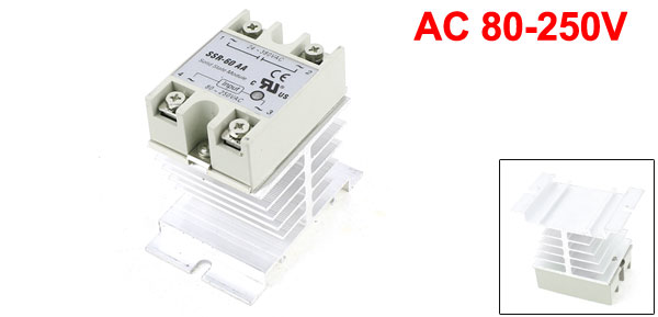Product Name Solid State Relay w Heatsink Model No. SSR-60AA Control Voltage AC 80-250V Output Voltage AC 24-380V 60A Phase Single Phase Screw Terminal 4 Fixing Hole Dia 5mm/0.2" Fixing Hole Center Distance 7.1cm/2.8" Relay Size (Approx.) 6 x 4.5 x 2.3cm/2.4" x 1.8" x 0.94"(L*W*H) Total Size 8 x 5 x 7.2cm/3.1" x 2" x 2.8"(L*W*H) Heatsink Material Aluminum, Plastic, Metal Color Silver Tone , Black, Clear Weight 206g Package Content 1 x Solid State Relay w Heatsink - Reviews