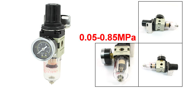 Product Name Pneumatic Regulator Model AW2000-02 Material Metal, Plastic Working Medium Air Max. Pressure 10Bar /150psi Set Pressure Range 0.05-0.85MPa Fluid Temperature 60°C / 140°F Joint Pipe Thread Diameter 12mm Joint Pipe Size 1/4 PT Gauge Connector Thread Diameter 9.5mm Gauge Range 0-10kgfc/m2 / 0-1Mpa Total Size 15.8 x 7.3 x 4.4cm/6.2" x 2.9" x 1.7"(L*W*H) Pressure Gauge Size(Installation Thread Non Included) 42 x 23mm/ 1.6" x 0.9" (D * T) Color Clear, Black, Gray Weight 310g Package Content 1 x Pneumatic Regulator