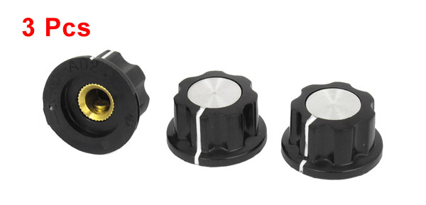 DetailsAdjustable Turn 19mm Top 6mm Shaft Insert Dia Potentiometer Rotary Knobs 3 Pcs  Product Name Potentiometer Knob Cap Material Plastic, Metal Color Silver Tone, Black Knob Top Diameter 19mm/0.75" Shaft Hole Dia. 6mm / 1/4" Overall Size 23mm x 13mm/ 0.91" x 0.51"(D*H) Weight 18g Package Included 3 x Potentiometer Knob