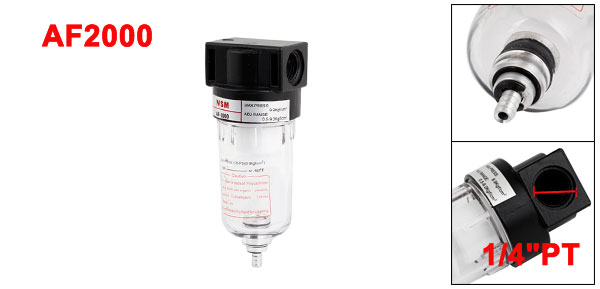 Product Name Air Source Treatment Model Number AF2000 Working Medium Air Adapter Diameter 1/4"PT Max Pressure 9.9 kg/cm2, -135PSI Pressure Range 0.05-0.85Mpa Max. Temperature 41-140 Degree Fahrenheit Size 11.5 x 4cm / 4.5" x 1.6"(L*Max.D) Material Aluminum Alloy, Plastic. Polycarboate Color Black, Clear Weight 78g Package Content 1 x Air Source Treatment