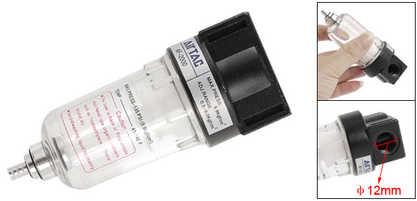 Product Name Air Source Treatment Model AF-2000 Material Metal, Plastic Working Medium Air Max. Pressure 9.9kgf/cm2 Adjustable Pressure Range 0.5-9.0 kg/cm² Joint Pipe Bore 12mm/ 0.5" Total Size 10.2 x 2.4 x 4cm / 4" x 0.9" x 1.6"(L*W*H) Color Black, Clear Weight 74g Package Content 1 x Air Source Treatment - Reviews