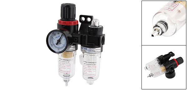 DetailsAFR-2000 AL-2000 Pneumatic Filter Regulator Air Source Treatment w 0-1MPa Gauge  Product Name Pneumatic Filter Regulator Model AFR-2000 AL-2000 Material Metal, Plastic Working Medium Air Max. Pressure 9.9kgf/cm2 Adjustable Pressure Range 0.5-9.0kgf/cm2 Thread Dia 11m/ 0.43" Pressure Gauge Range 0-1MPa/ 0-10kgf/cm² Hose Connector Dia 5mm/ 0.196" Mounting Hole Size 8 x 7mm/ 0.33" x 0.28"(L*W) Total Size 160 x 90 x 85mm / 6.3" x 3.5" x 3.3"(L*W*H) Pressure Gauge Size 41 x 38mm/ 1.6" x 1.5"(D*T) Color Black, Clear Weight 343g Package Content 1 x Pneumatic Filter Regulator 1 x Pressure Gauge