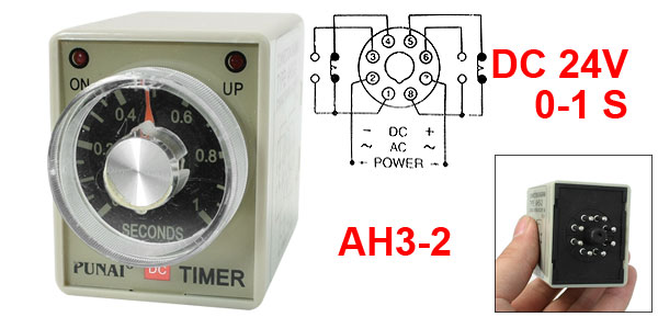 DetailsAH3-2 DC 24V 8 Pins DPDT 0-1 Seconds 1Sec Power on Delay Timer Time Relay  Product Name Time Relay Model Number AH3-2 Contact Resistive Load AC 220 5A Rated Voltage DC 24V Contact Type DPDT, 2NO 2NC Number of Terminals 8 Pins Time Range 0-1 Seconds Indicator Operation On-Up Two LED Indicator Light External Material Plastic & Metal Mounted Size 50 x 40 x 58mm / 2" x 1.6" x 2.3"(L*W*H) Total Length 79mm/3.1" Color Gray Net Weight 63g Package Content 1 x Power On Time Relay