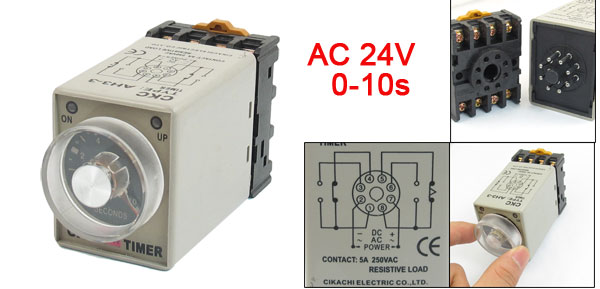 Product Name Time Relay w Base Type AH3-3 Coil Voltage 24V AC Contact Type DPDT Contact 5A 250VAC Resistive Load Time Range 0-10 Seconds