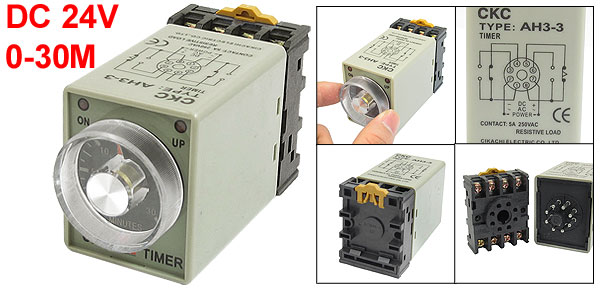 Product Name Time Relay w Base Type AH3-3 Coil Voltage 24V DC Contact Type DPDT Contact 5A 250VAC Resistive Load Time Range 0-30 Minutes