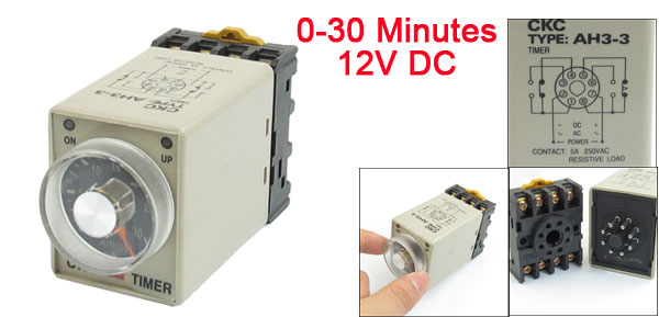 Product Name Time Relay w Base Type AH3-3 Coil Voltage 12V DC Contact Type DPDT Contact 5A 250VAC Resistive Load Time Range 0-30 Minutes
