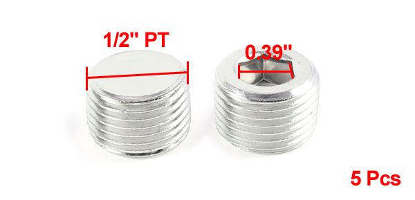 Product Name Hex Head Pipe Plug Color Silver Tone Material Metal Male Thread Size 1/2" PT Height 14mm/ 0.5" Hex Side to Side Diatance 10mm/ 0.39" Net Weight 134g Package Content 5 Pcs x Hex Head Pipe Plug - Reviews