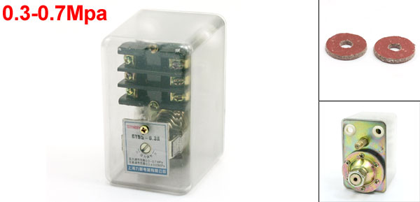 Product Name Pressure Switch Model No. GYD5-6.3/A Female Thread Diameter 15mm Inlet Port Size G3/8" Outlet Port Thread M10x1 Pressure Range 0.3-0.7Mpa Size 13 x 10.3 x 6.5cm/5.1" x 4" x 2.6"(L*W*H) Main Color Black Material Plastic, Metal Weight 613g Package Content 1 x Pressure Switch - Reviews
