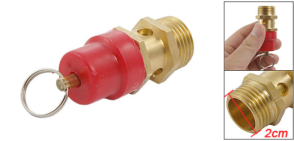 Product Name Pressure Relief Valve Material Plastic, Metal Color Red, Gold Tone Thread Diameter 2cm / 0.79" Ring Diameter 1.6cm / 0.63" Valve Total Size 5 x 2.2cm / 1.96" x 0.86" (L*Max.D) Weight 72g Package Content 1 x Pressure Relief Valve - Reviews