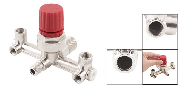 Product Name Pressure Regulator Valve Fitting Material Plastic, Metal Color Red, Silver Tone, Gold Tone Male Thread Dia 13mm/ 1/4"PT, 21mm/ 1/2"PT Female Thread Dia(Each) 12.5mm/ 1/2" Valve Total Size 125 x 80 x 88mm/ 4.9" x 3.1" x 3.4"(L*W*T)