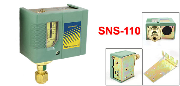 Product Name Pressure Switch Model NO. SNS-110 Adjustable Range 1cmHg - 1.0 Mpa / 9-43PSI Differential 0.1 - 0.3Mpa /5-29 PSI Flare Hex Nut Size 16.8mm/ 0.66" Overall Size 8 x 4.6 x 10cm/ 3.1" x 1.8" x 3.9" (L*W*H) Color Green, Gold Tone Material Metal Net Weight 316g Package 1 x Pressure Switch