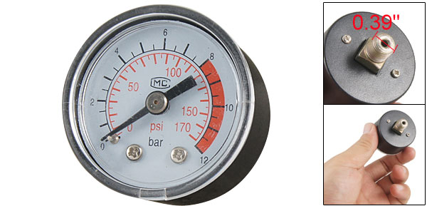 Product Name Compressor Gauge Material Metal, Plastic Type Dial Type Pressure Range 0 ~ 170 PSI, 0 ~ 12Kg/cm2 Thread Diameter 10mm/ 0.39" Case Size (Approx) 41 x 38mm/ 1.6" x 1.5" (D*T) Color White, Black, Red Weight 25g Package Content 1 x Compressor Gauge - Reviews