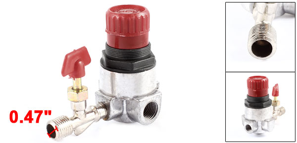 Product Name Air Compressor Valve Switch Design Single Outlet Material Plastic, Metal Color Red, Silver Tone Male Thread Diameter 12mm/ 0.47" Female Thread Diameter Big:11mm/0.43", 9mm/0.35" Valve Total Size 8.2 x 4.2 x 7.3cm / 3.2" x 1.7" x 2.9" (L*W*H) Weight 108g Package Content 1 x Air Compressor Valve Switch - Reviews